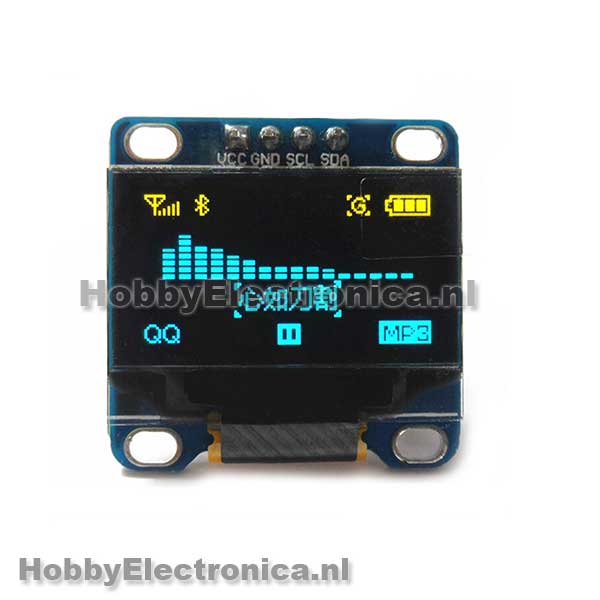 128X64 OLED geel blauw i2c display module voor Arduino en andere microcontrollers. Deze kleine displays zijn heel leesbaar door het hoge contrast van OLED displays. Gemaakt van 128×64 individuele OLED pixels, die elk aan en uitgezet kunnen worden door de driver chip. Geen backlight nodig, dit display geeft zelf licht en heeft daardoor minder stroom nodig.