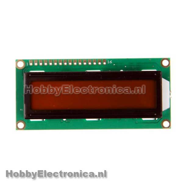 1602 LCD display oranje backlight. 2 regels, 16 karakters per regel. Hoog contrast en grote kijkhoek. Contrast instelbaar door middel van een aan te sluiten regelbare weerstand (potentiometer).