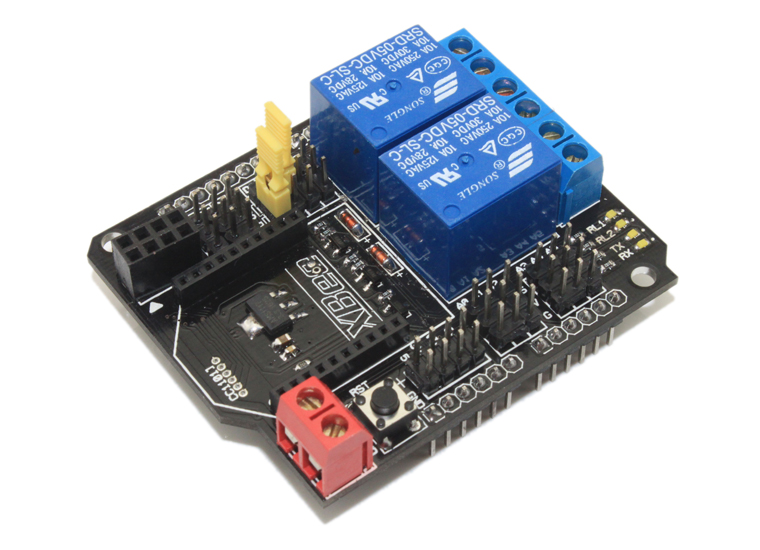 2 Kanaals relais shield kan direct vanaf je Arduino 2 relais schakelen. Het maximale schakel vermogen is 10A/250VAC of 10A/30VDC. Het kan direct worden bediend vanaf een Arduino via digitale IO’s met externe 9V voeding. Met ingebouwde xbee socket type, zodat deze draadloos kan worden aangestuurd via Xbee. Een ideale oplossing voor domotica en robotica doeleinden.
