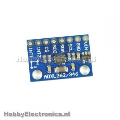 ADXL346 is een kleine, zuinige 3-assige versnellingsmeter, 13bit met een hoge resolutie tot ongeveer 16g. Digitale output door de SPI of I2C interface.