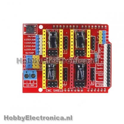 Arduino CNC shield v3. Voor het aansturen van een CNC, graveer machine of 3d printer. Kan tot 4 stappen motoren aansturen. Heeft maar 2 io poorten nodig per motor.