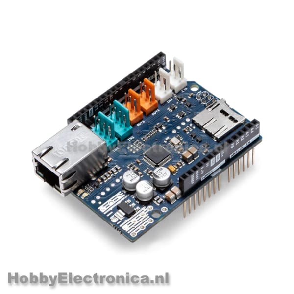 Arduino Ethernet Shield 2 heeft een W5500 ethernet controller en een microSD kaart lezer. Verbindt uw Arduino in slechts enkele minuten met internet. Sluit deze module gewoon aan op uw Arduino-bord, sluit hem aan op uw netwerk met een RJ45-kabel (niet meegeleverd) en volg een paar eenvoudige stappen om uw wereld via internet te besturen.