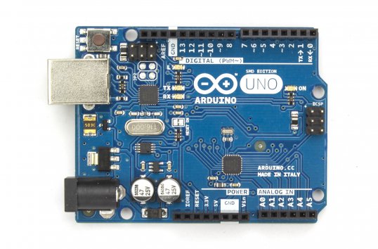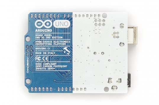 De Arduino Uno SMD Rev3 is een microcontroller board gebaseerd op de ATmega328 chip. De Uno heeft 14 digitale input/output pins (waarvan er 6 gebruikt kunnen worden als PWM outputs), 6 analoge inputs, een 16 MHz keramische resonator, een USB connector, een power jack, een ICSP header en een reset button.