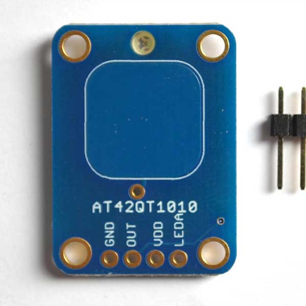 AT42QT1010 Capacitive touch sensor. Wanneer een capacitieve belasting wordt gedetecteerd (bijvoorbeeld een persoon raakt de sensor-pad gebied) de rode LED gaat branden en de output pin gaat hoog. Werkt ook stand alone zonder microcontroller, stroom aansluiten 1.8 – 5.5V en hij werkt. Om stroom te besparen kan de led uitgeschakeld worden.