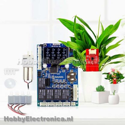 Automatische smart plant water kit is gebaseerd op Arduino Lenardo die is geïntegreerd in het moederbord. We voegen een RTC toe om de timing in te stellen voor het water geven en een 0.96 inch OLED om de tijd en de bodemvochtigheid status weer te geven. De kit bevat een pomp, capacitieve bodemvochtigheid sensoren, waterschakelaar om het water naar maximaal 4 planten te leiden en leidingen waar het water doorheen kan gaan. In vergelijking met de weerstands vochtsensor is de bodemvochtigheid sensor gemaakt van een corrosiebestendig materiaal, dat een lange levensduur zal hebben.