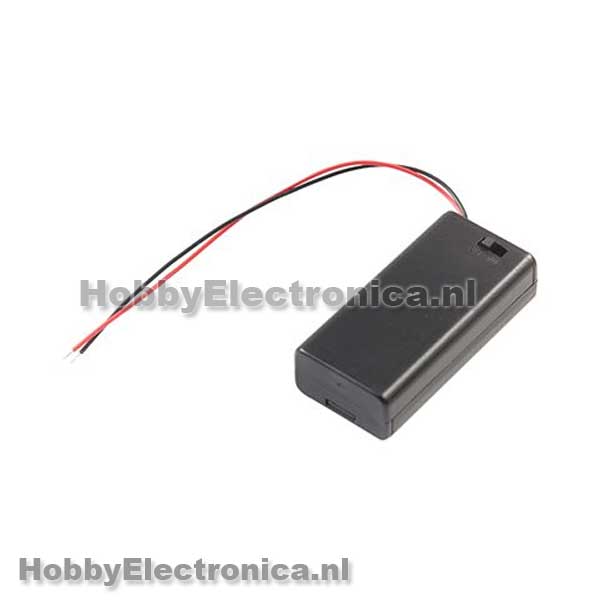 Batterij houder 2xAA. Deze batterij houder komt met een deksel, aan/uit schakelaar en aansluitdraden. Er passen twee AA batterijen in.