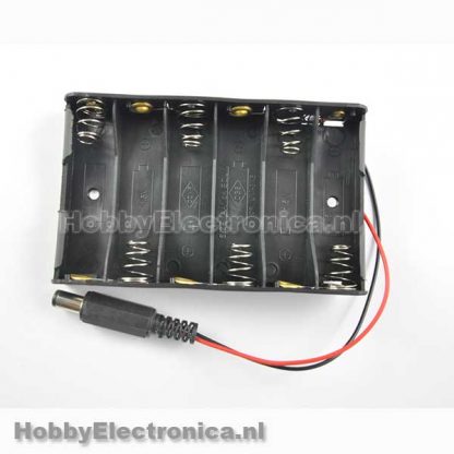 Batterij houder 6 x AA met 2.1mm plug, center pin positief, pas op een Arduino. Met gewone batterijen goed voor 9V met oplaadbare batterijen 7.2V. Voor Arduino of smart car.