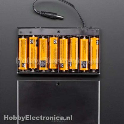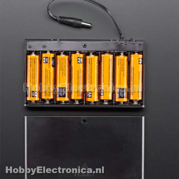 Batterij houder 8 x AA met switch en plug met 2.1mm, center pin positief, past op een Arduino. Met gewone batterijen goed voor 12V met oplaadbare batterijen 9.6V. Voor Arduino of smart car. Met aan uit switch.