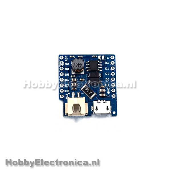 Batterij Wemos shield hiermee kan het Wemos bord gevoed worden met een 3.7V Lipo batterij. Met een laad circuit met usb aansluiting. 2 status led, rood = laden, groen is volledig opgeladen. Laad stroom kan via een jumper worden ingesteld op 0,5A of 1A. Naar gelang de specificaties van de batterij. Let op de polariteit bij het aansluiten van de batterij.