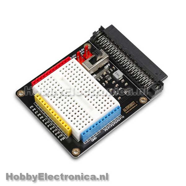 BBC Micro bit Prototype. Dit shield of extensie bord voor de microbit breekt de pinnen en voeding uit. Dit maakt het makkelijkere om te prototypen op een breadbord. Word geleverd met een mini breadbord die precies tussen de headers past. Heeft ook input pinnen voor voeding.