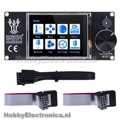 BigTreeTech TFT24 v1.1 touch screen met een krachtige 32-bit processor. Heeft verschillende installatie mogelijkheden: UART serieel of 12864 modus. Dit scherm heeft een afmeting van 105x46mm. Heeft 2 print modes via de SD kaart of USB stick, beide aansluitingen zijn voorzien.