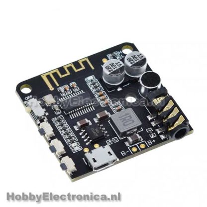 Bluetooth 5 MP3 decoder bord. Hiermee kan bluetooth aan je versterker/muziek systeem toevoegen. Streamen via bluetooth en output via de 3.5mm interface. Kan worden gevoed via de micro USB aansluiting met 5V en heeft ook een aansluiting voor een batterij 3,7V – 5V. Led indicator voor de bluetooth mode. 3.5mm stereo audio interface.