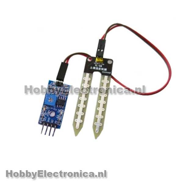 Bodemvochtigheids sensor om de vochtigheid van de grond/bodem te meten op basis van de LM393 chip. De digitale output op de module is hoog als de grond/bodem te droog is en laag als de bodem nat is instelbaar met een potmeter.