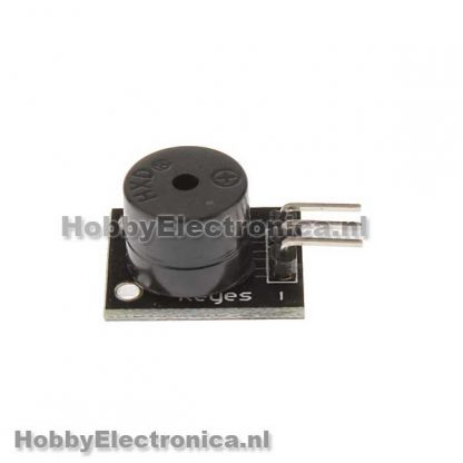 Het is gewoon een actieve buzzer met twee aansluitingen en er zit geen weerstand en transistor op het printplaatje, wat sommige modules wel hebben.