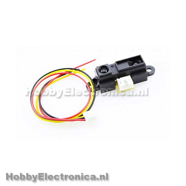 Crowtail 80cm Infrared Proximity Sensor. De Sharp afstand sensoren zijn een populaire keuze voor vele projecten die nauwkeurige afstand metingen vereisen. Deze IR-sensor is zuiniger dan sonar afstandmeters, maar het levert veel betere prestaties dan andere IR alternatieven. Koppeling met de meeste microcontrollers is eenvoudig: de interne analoge uitgang kan worden aangesloten op een analoog-naar-digitaalomzetter voor het nemen afstandsmetingen of de uitgang kan worden verbonden met een comparator voor drempeldetectie. Het detectiebereik van deze versie is ongeveer 10 cm tot 80 cm.