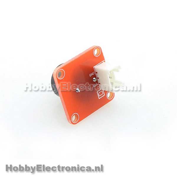 Crowtail Buzzer voor het maken van geluid. Te activeren door een hoog signaal naar de aangesloten pin te sturen. Kan ook worden aangesloten op een Analoge PWM pin en kan zo verschillende tonen maken.