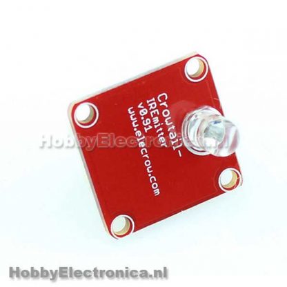 Crowtail IR Zender infrarood is een LED gemaakt van galliumarsenide, met zijn kleur gecentreerd rond 940nm. Het wordt gebruikt om infrarode signalen te versturen.