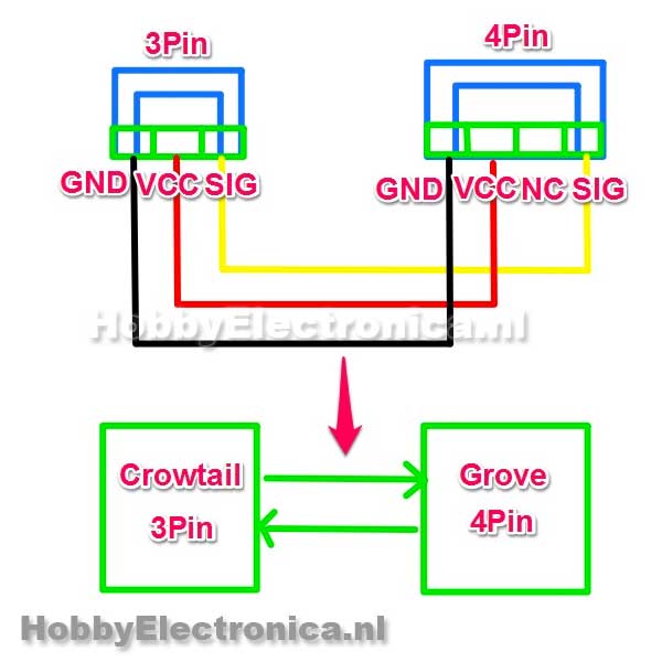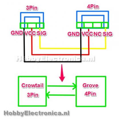 Crowtail naar Grove Convertor is een compatibel kabel tussen het Crowtail-systeem en Grove-systeem. Het kan elke crowntail module aan sluiten op het Grove base shield of naar andere compatibele boards. Of een Grove module naar het Crowtail Basis Shield.