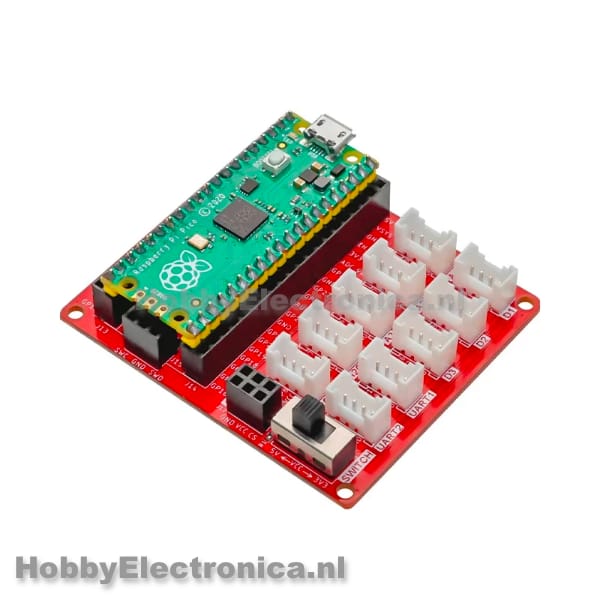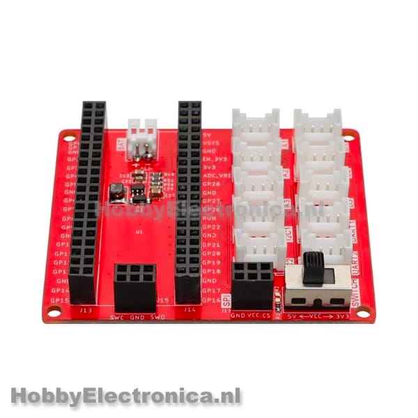 Crowtail shield Raspberry Pi pico is een plug-and-play uitbreidingsbord voor Raspberry Pi Pico, waarin verschillende Crowtail-connectoren zijn geïntegreerd, waaronder 2*I2C, 3*Analog, 2*UART, 3*Digitale poorten, 1*BAT, SWD debug-interface en SPI-pin, 3.3v /5v selecteerbare aan/uit-schakelaar. Het shield is een stapelbaar uitbreidingsbord. U kunt de voor gesoldeerde Pico direct gebruiken en op het shield aansluiten, de sensoren uit de Crowtail-serie aansluiten en beginnen met het ontwikkelen van uw nieuwe project.
