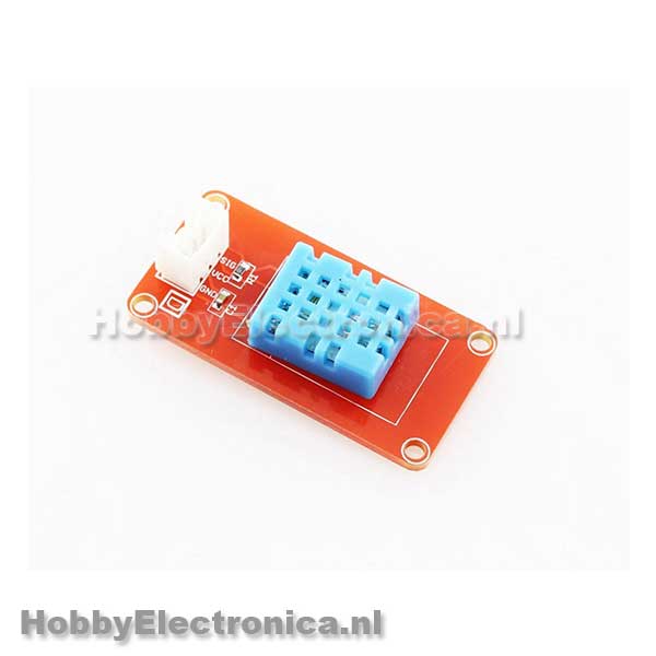 Crowtail Temperatuur en vochtigheid Sensor. De module bevat een DHT11 temperatuur en vochtigheid sensor. Dit is een complexe sensor met een geijkte digitale signaal. Deze bestaat uit een soort weerstand vocht element en een NTC temperatuur meetelement. Door de enkele draad seriële interface is hij gemakkelijk om te gebruiken.