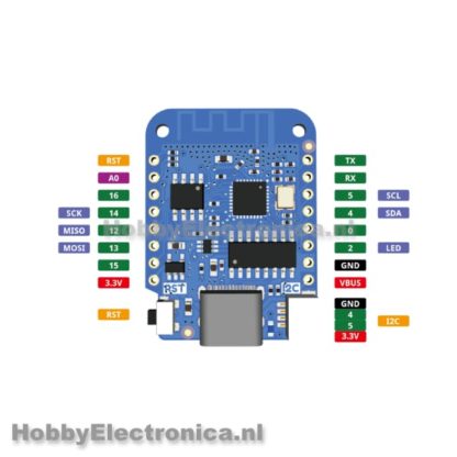 D1 mini v4 usb c de opvolger van versie 3 met usb-c voeding, gebaseerd op de populaire ESP8266-8266EX Wifi module. Onboard JST-SH 4p verbinding om I2C sensoren aan te sluiten. CH340 USB-naar-serieel converter voor het programmeren. Uiteraard in dezelfde form factor, zodat alle D1 shields gewoon te gebruiken zijn.