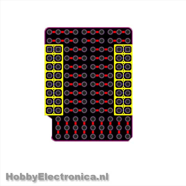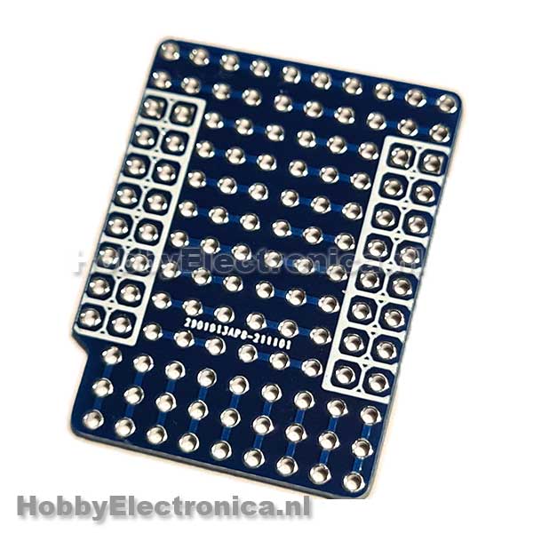 D1 Protoshield v2 maximaal benut qua gaten. De middelste rijen zijn verbonden, zie de foto voor alle verbonden gaten.