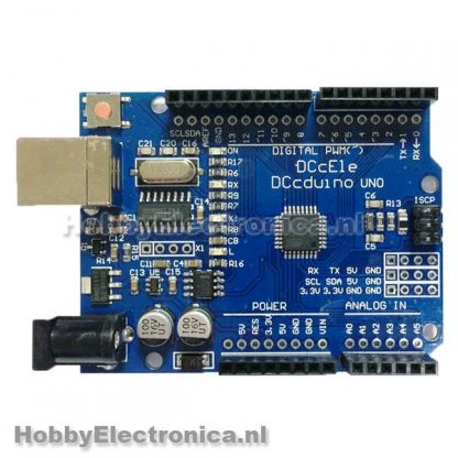 Dccduino Uno is een kloon van het Arduino ontwerp met Atmega328P chip. Er zijn enkele verbeteringen doorgevoerd. De USB interface wordt aangestuurd door de stabielere CH340G chip. Extra header mogelijkheden met meegeleverde male headers.