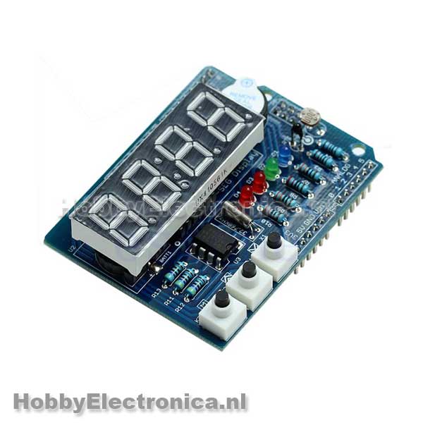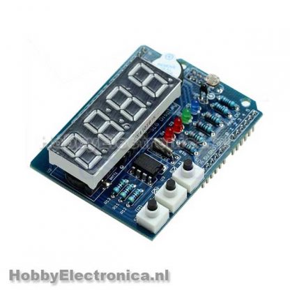 Digitaal klok shield RTC. Arduino compatible shield met een digitale klok. Het shield heeft een Real Time Clock module de DS1307, met een batterijhouder(geleverd zonder batterij). Een 4x 7 segments display, 3 push buttons, 4 LED’s, lichtsensor, temperatuur sensor en een buzzer.
