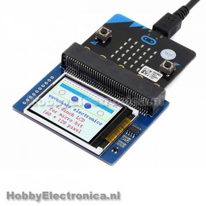 Displaybit 160×128 1.8 Inch. Dit is een kleurrijke weergavemodule ontworpen voor de BBC micro: bit, 1,8 inch diagonaal, 160×128 pixels, geschikt voor weergave van 65K kleuren.