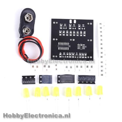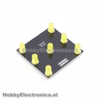 Dobbelsteen touch soldeer kit. Maak je eigen digitale dobbelsteen met touch knop om te activeren en te dobbelen. Let op deze kit heeft SMD componenten en is iets lastiger te solderen dan THT componenten. Werk met een 9V batterij blok.