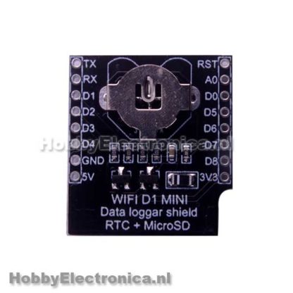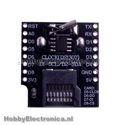 Datalogger shield wemos D1 form factor. Met dit shield kun je gegevens opslaan op een SD-kaart. De RTC (Real Time Clock) chip op basis van de DS1307 kan worden gebruikt om een tijdstempel toe te voegen, zodat u de exacte tijd van elk record weet! De back-upbatterij met knoopcel houdt de real-time klok gaande, zelfs als de stroom is uitgeschakeld. De real-time klok heeft bescherming tegen omgekeerde polariteit. Geleverd met losse headers.