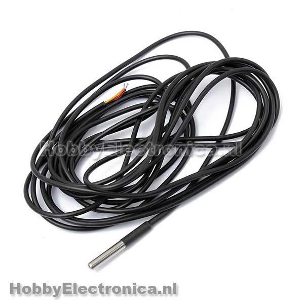 DS18B20 waterdicht 12 meter is een Dallas one-wire device, dat wil zeggen dat input en output over dezelfde pin gaan zodat je meerdere devices kan aansluiten op dezelfde pinnen. Waterdichte versie voor oa het meten van vloeistof temperatuur. Versie met een extra lang snoer van 12 meter.