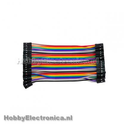 Dupont female-female 10cm 40 draden. De DuPont kabels om modules aan te kunnen sluiten op een arduino, breadboard of ander microcontroller. De Male <-> Female ook gebruikt worden als verlenging. Geleverd als flat cable met 40 draden in 10 verschillende kleuren. Deze kunnen gemakkelijk worden gescheiden.