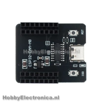 ESP32 Cam shield usb c. Met dit shield kunt u eenvoudig de ESP32 CAM aansluiten via micro USB op uw computer om deze te programmeren. Het shield is voorzien van een serial chip de CH340.