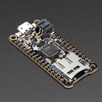 Feather 32u4 Adalogger. Feather is het nieuwe ontwikkelings bord van Adafruit. Op basis van de ATmega32U4 geklokt op 8 MHz en op 3.3V logica. Met micro SD kaart houder voor het loggen van data. Deze chip heeft 32K flash en 2K RAM. Met ingebouwde USB voor het programmeren, maar kan ook worden gebruikt als muis, toetsenbord en dergelijke. Ondersteund in de Arduino IDE.