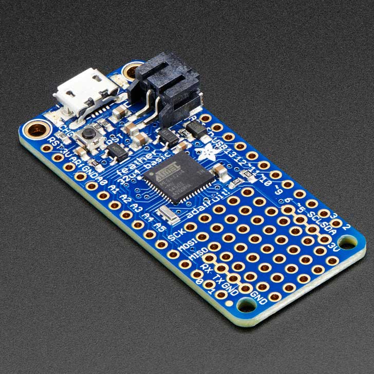 Feather 32u4 Basic Proto. Feather is het nieuwe ontwikkelings bord van Adafruit. Op basis van de ATmega32U4 geklokt op 8 MHz en op 3.3V logica. Deze chip heeft 32K flash en 2K RAM. Met ingebouwde USB voor het programmeren, maar kan ook worden gebruikt als muis, toetsenbord en dergelijke. Ondersteund in de Arduino IDE.