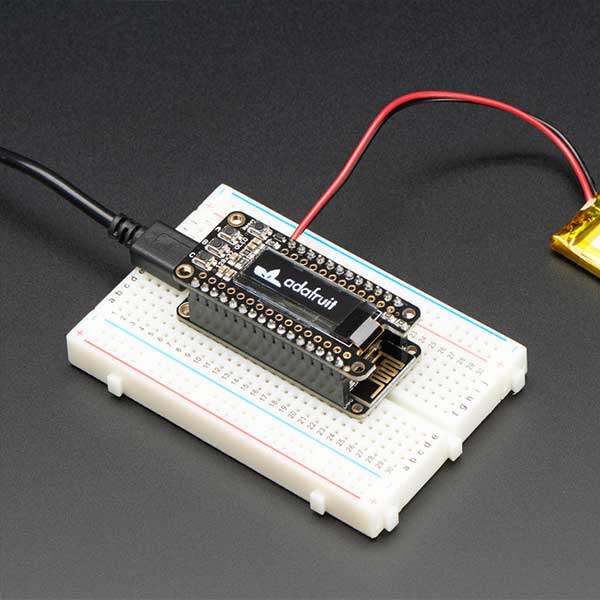 FeatherWing OLED 128×32 monochrome OLED met 3 buttons vrij te gebruiken als user interface. Feather is het nieuwe ontwikkelings bord van Adafruit. De FeatherWing is als een shield voor de Feather borden. Deze displays zijn klein, slechts ongeveer 1″ diagonaal, maar zeer leesbaar vanwege het hoge contrast van een OLED beeldscherm. Dit scherm is gemaakt van 128×32 afzonderlijke witte OLED-pixels en met backlight. De OLED gebruikt alleen de twee I2C pinnen op de Feather.