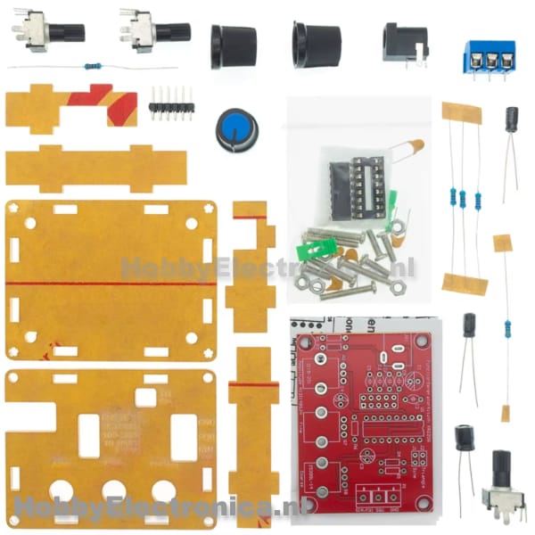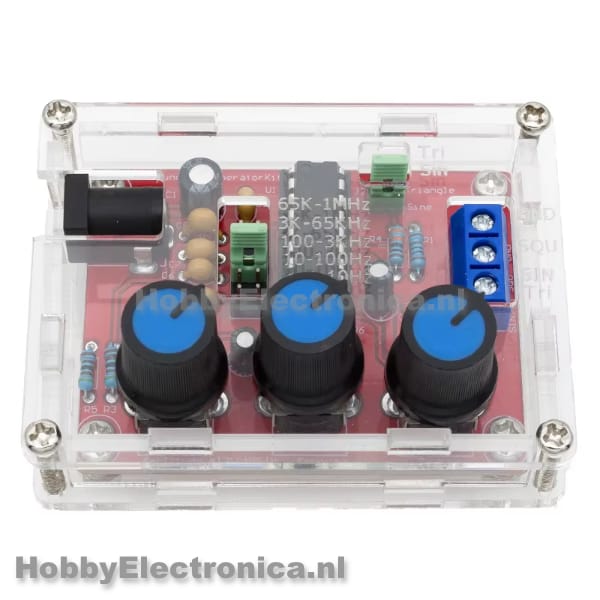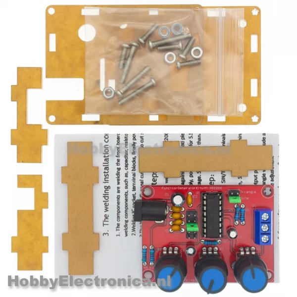 Functiegenerator soldeer kit 1Hz-1MHz met 3 golfvormen gebaseerd op de XR2206 IC, geschikt voor het genereren van drie verschillende golfvormen met instelbare frequentie en amplitude.