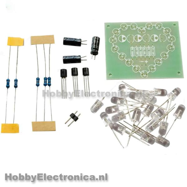Hart met leds kit. Leuke kit met led’s in hart vorm, om te beginnen met solderen. Werkt op een 3-5 volt voeding.