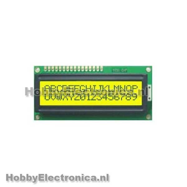 HD44780 16×2 LCD controller met 16×2 Karakters display module. Geel backlight en groene karakters. 2 regels, 16 karakters per regel. Hoog contrast en grote kijkhoek.