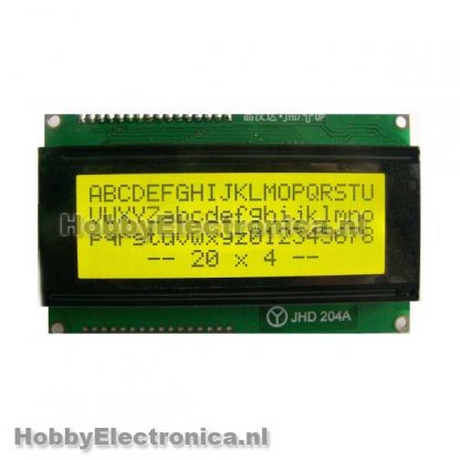 HD44780 20×4 LCD geel backlight display module. Geel backlight en groene karakters. 4 regels, 20 karakters per regel. Hoog contrast en grote kijkhoek. Het contrast van het display is instelbaar middels de los leverbare I2C interface of met een regelbare weerstand