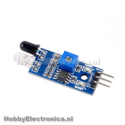 Infrarood obstakel vermijdingsmodule. Leest afstand tot obstakels op een afstand van 2-30cm en 35 graden door middel van infrarood signalen. Bevat een infrarood zender en ontvanger. Geeft een 5V signaal als er geen obstakels zijn en een 0V signaal als er een obstakel is en de groene LED gaat branden. De afstand kan worden aangepast met een potentiometer. Werkt met 3.3V en 5V, heeft een rode power led.