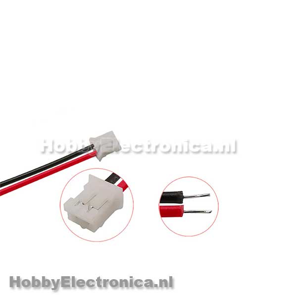 JST-PH2.0 2P vrouw connector met 20 centimeter 26AWG draad. Veel gebruikt aan lipo batterijen.