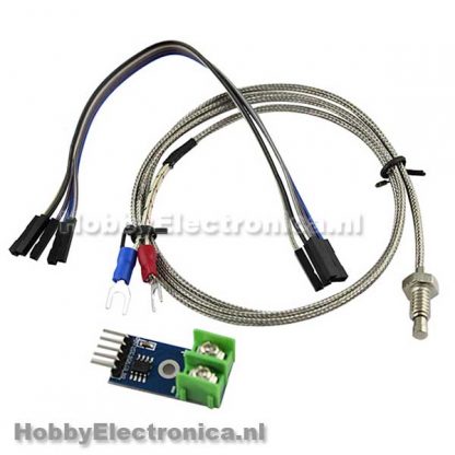 K-Type Thermocouple met digitale converter op basis van MAX6675 chip. De MAX6675 voert Cold-Junction en digitaliseert het signaal van een type-K thermokoppel. De gegevens worden uitgevoerd in een 12-bit resolutie, SPI ™ compatibel, read-only format. Deze converter voert metingen uit tot + 1024 ° C en heeft een thermokoppel nauwkeurigheid van 8LSBs voor temperaturen van 0 ° C tot + 700 ° C.