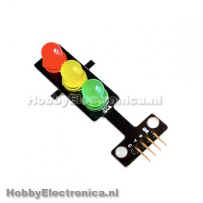 LED Stoplicht module 5V. Eenvoudige module met 3x 5mm common cathode led’s, rood geel en groen, te bedienen met een hoog signaal per pin. Kan ook met een PWM signaal worden bediend. Kleine module: 56*21*11MM, eenvoudig aan te sluiten. Verbruik: rood 13mA, geel 13mA, groen 25mA.