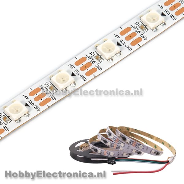 Led strip ws2812b rgb 5m 60led IP20. Slimme LED strip met 60 pixels per meter op een zwarte PCB. WS2812 chips met SMD5050 LED’s, gevoed op 5 volt. Heeft een plakstrip aan de achterkant en een IP20 rating, dus voor binnen gebruik. Werkt met de Neopixel library. 2 connectors per reel. Geleverd per 5 meter.