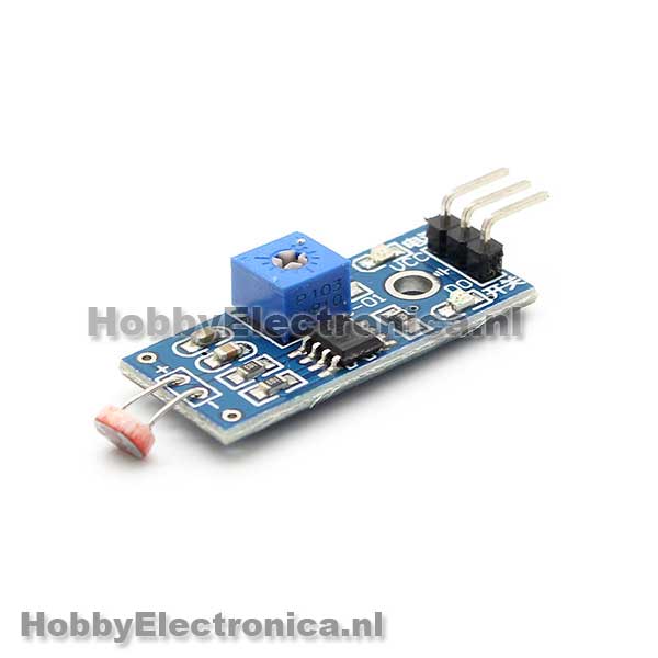 Lichtsensor LDR module meet de hoeveelheid licht die er op valt afhankelijk van de lichtintensiteit zal de digitale uitgang van 0 naar 1 gaan. De lichtgevoeligheid is in te stellen met de regelbare weerstand. Door middel van de headers is deze eenvoudig op een breadboard aan te sluiten. Handig voor bijvoorbeeld Domotica projecten om de lichten te schakelen.