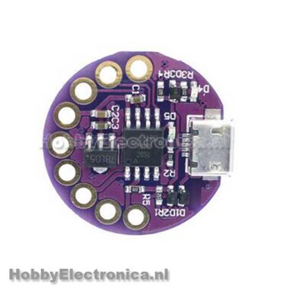 LilyPad ATtiny85 voor draagbare projecten. Wordt ook veel gebruikt vanwege de compatibiliteit met de Arduino IDE, waardoor een ATtiny85 en de nodige circuits kunnen worden geprogrammeerd via USB. Programmeren is eenvoudig via de micro usb aansluiting. Het bord heeft 6 logische poorten voor prototyping. Het board kan gevoed worden met 7-12V(op VIN pin) of rechtstreeks op de 5V pin.
