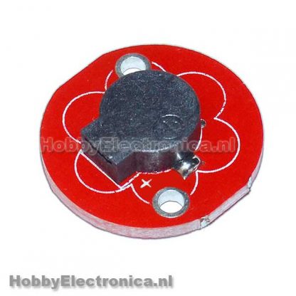Lilypad buzzer module. Gebruikt 2 I/O pinnen op de LilyPad en kan verschillende geluiden produceren op basis van de verschillende frequenties. Luid genoeg om te horen in een zak.