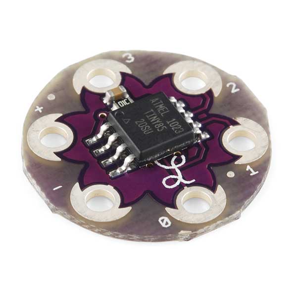 LilyTiny is een klein LilyPad bord ontwikkeld om LED’s aan te sturen, voor projecten met weinig ruimte. Zo klein als sommige van de Lilypad sensoren mear met een ATtiny aan boord. Simpel 4 LED er aan naaien en een batterij aan sluiten en de LED gaan knipperen of faden. Elke pin heeft een ander LED effect geprogrammeerd.